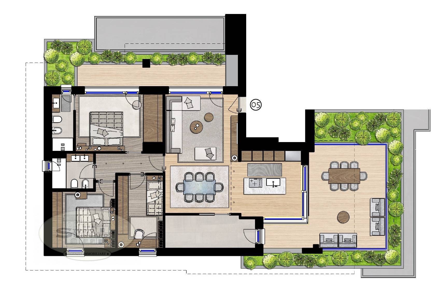 dall'ingresso si accede al soggiorno con cucina a vista ; finestre importanti si affacciano sull'esclusivo terrazzo, quasi completamente coperto;